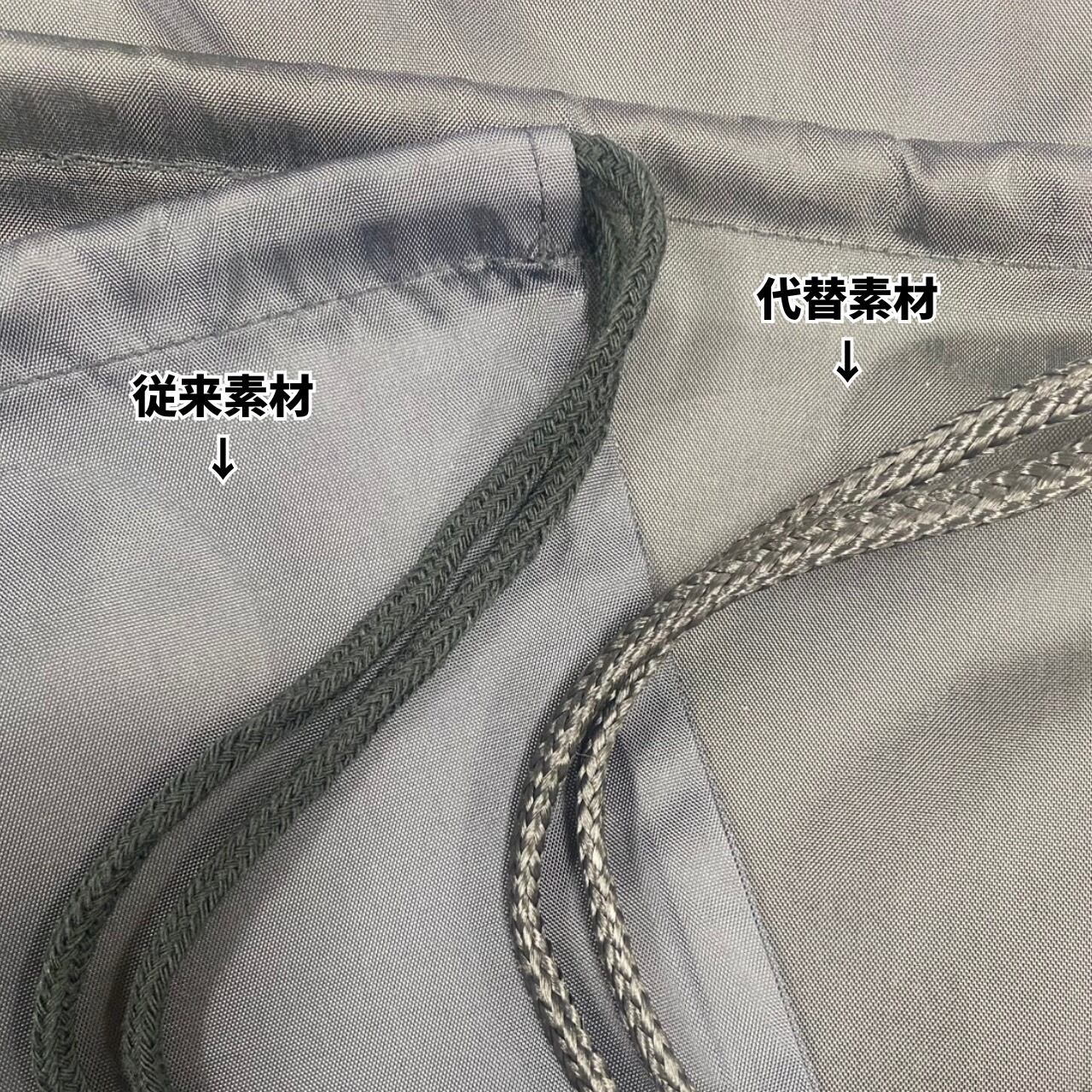 尚、代替素材と従来素材の違いは、色味と紐の素材が若干異なる点です。